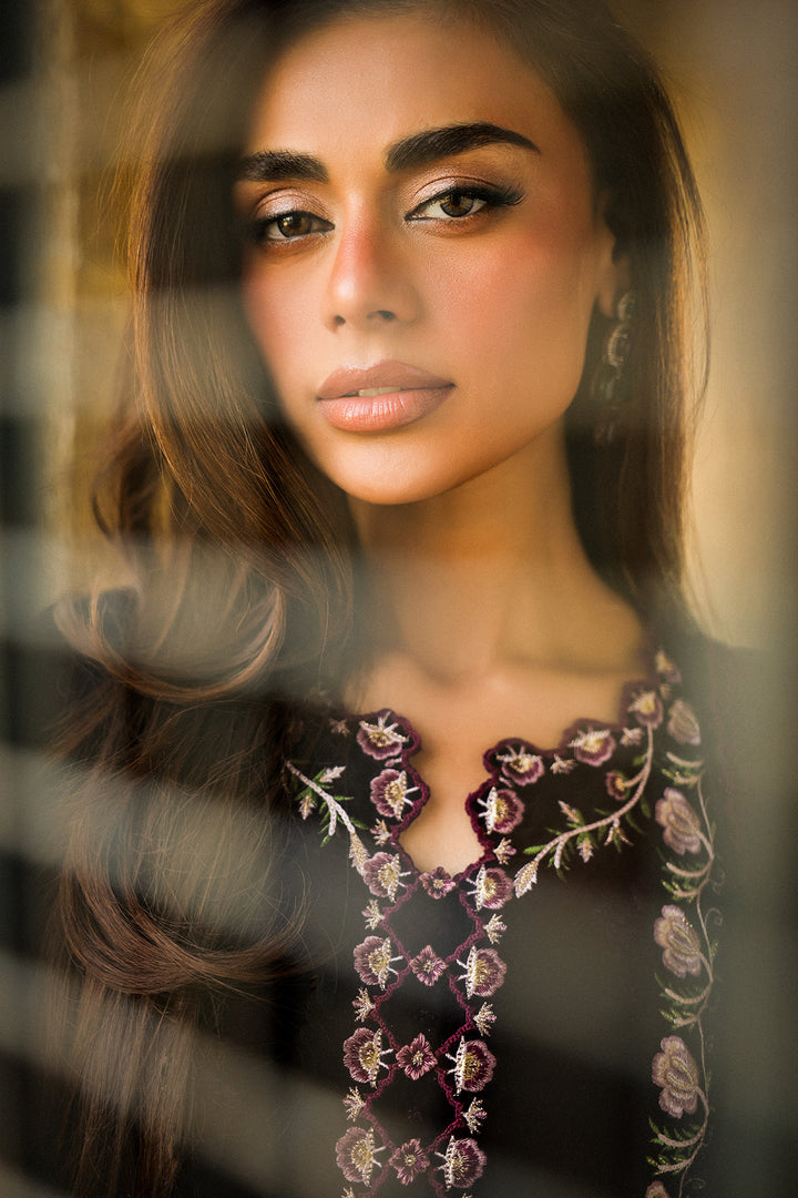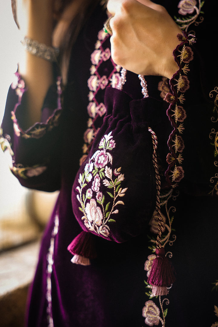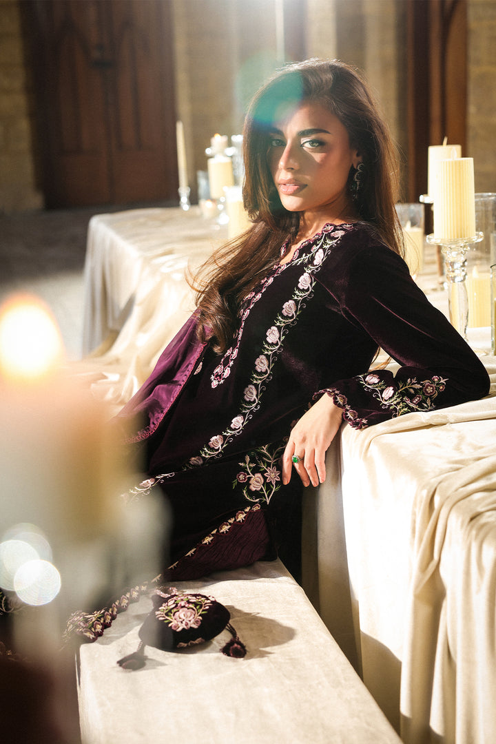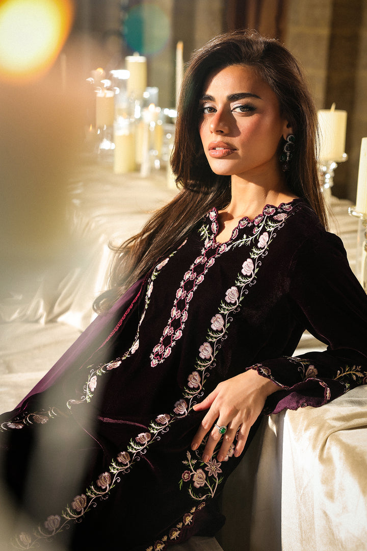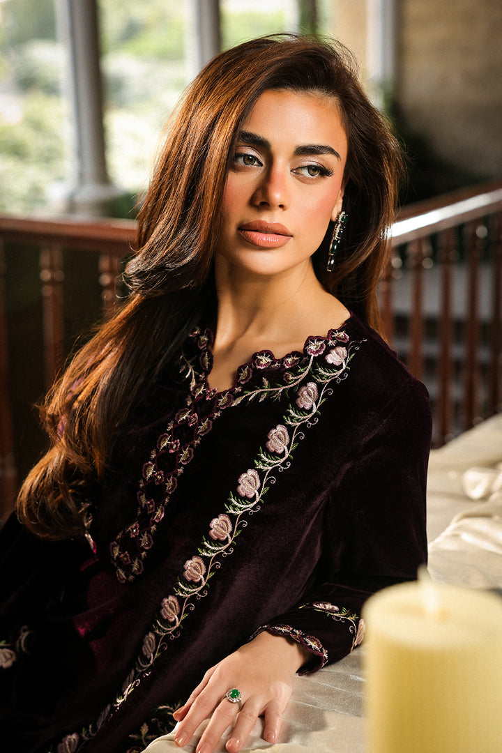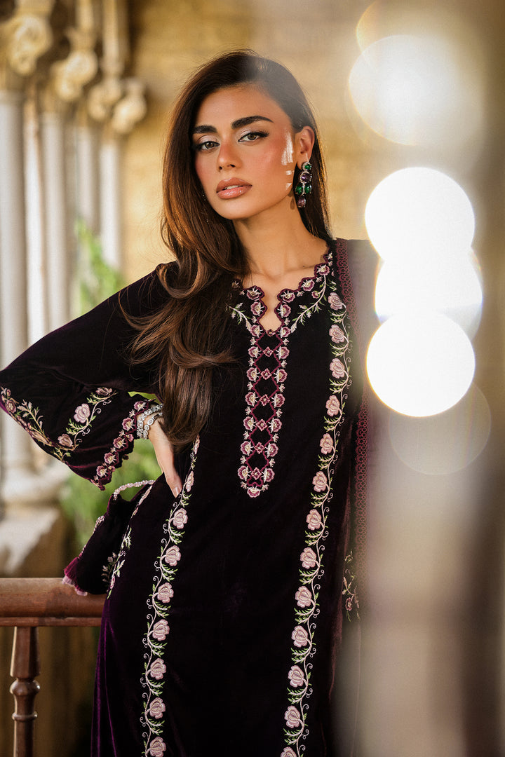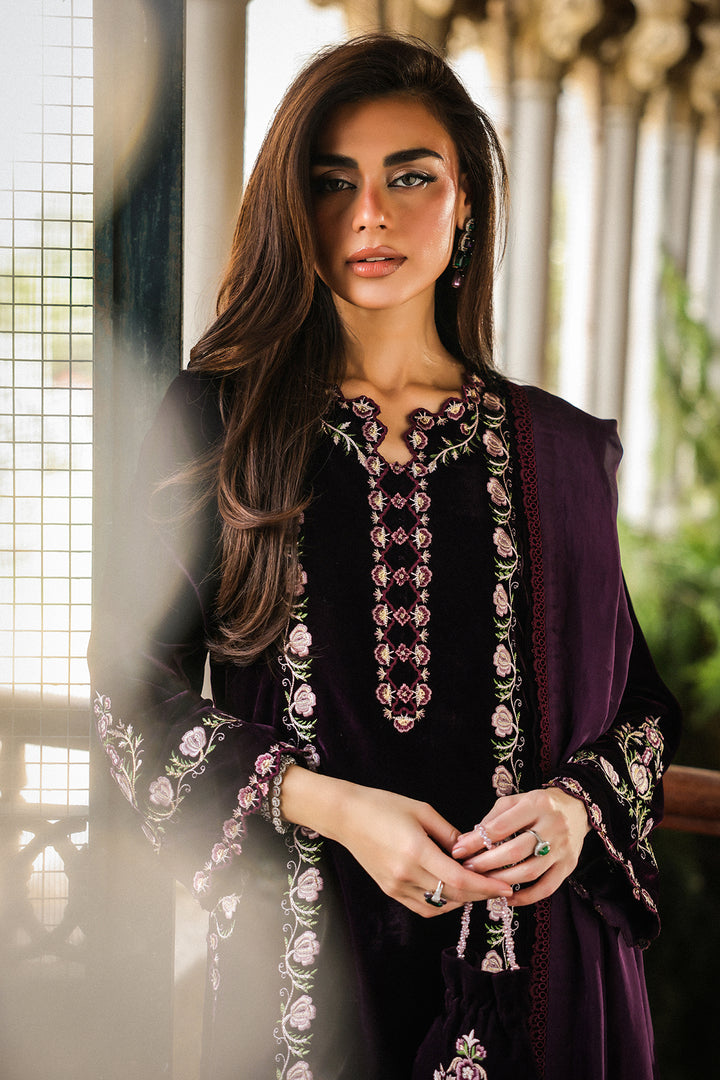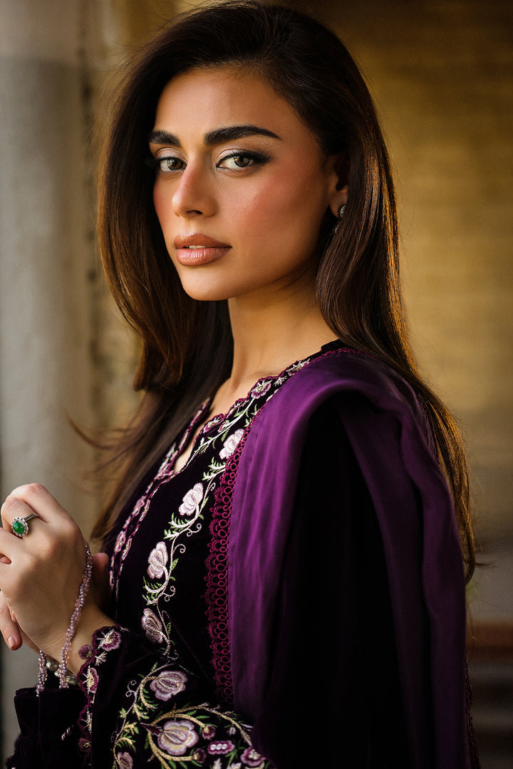 This deep Purple velvet 3-piece suit offers an aura of understated grandeur. The rich dark hue complements the gold embroidery running along the front and sleeves. Paired with gharara-style bottoms and dupatta. Creating a sleek and royal outfit for intimate gatherings or elegant soirées.