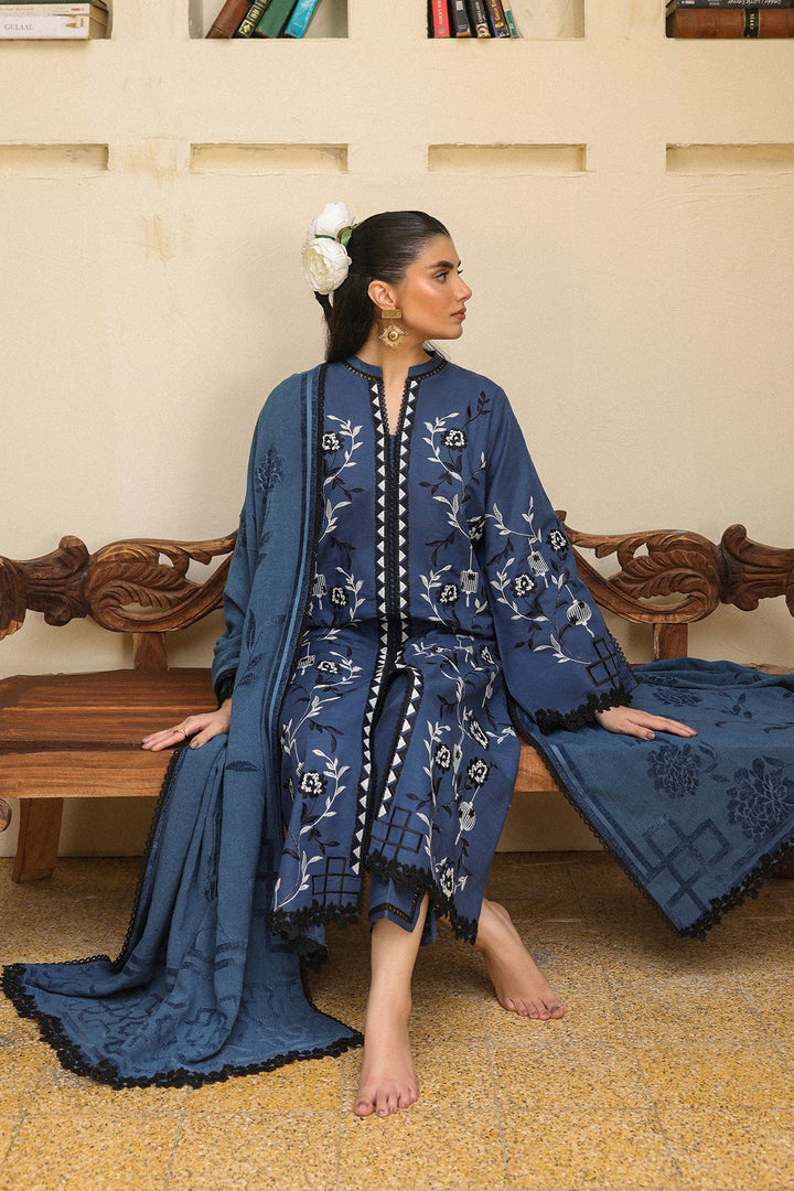 Make a bold yet graceful statement with this deep blue khaddar embroidered outfit. It features oriental floral embroidery in contrasting tones of white and black, enhanced with delicate lace trims along the sleeves and hem. Paired with tailored trousers showcasing subtle embroidered details and a flowing velvet woven shawl edged with lace, this ensemble strikes the perfect balance between tradition and modernity. The rich hue and refined detailing make it a versatile choice for festive winter evenings and family gatherings.