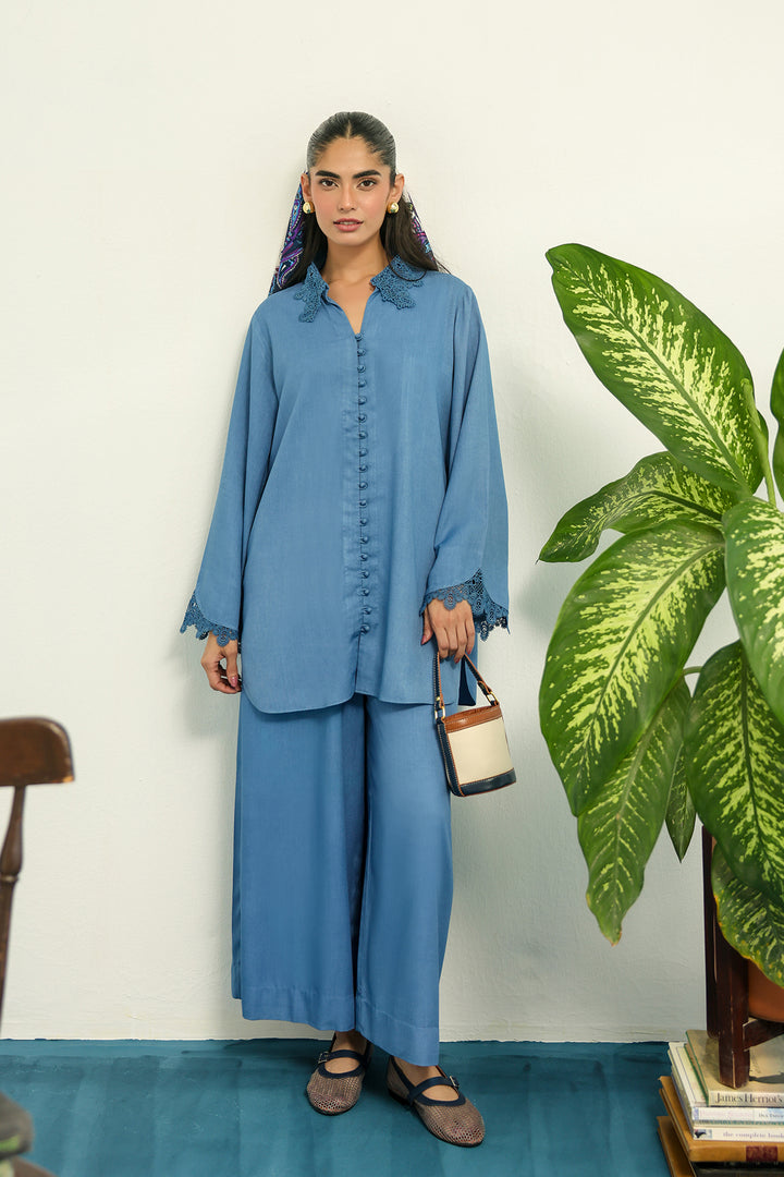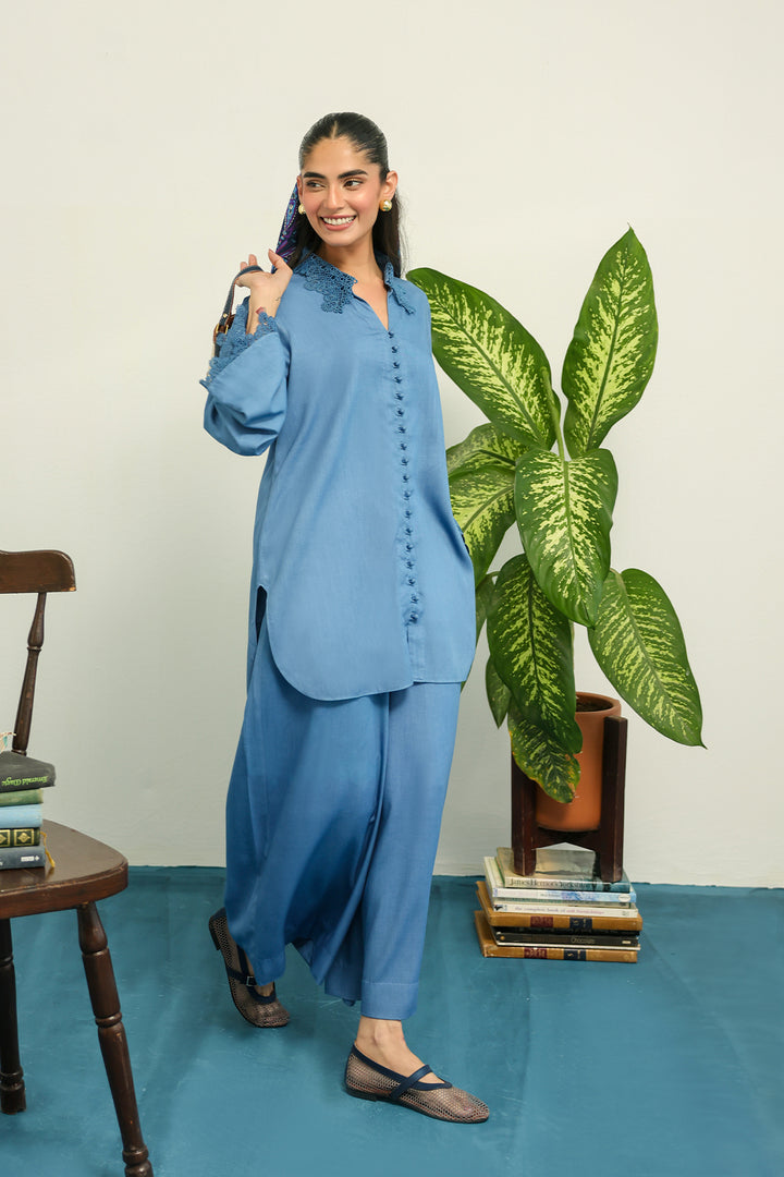 This chic outfit features a relaxed button-down shirt with intricate lace detailing on the collar and cuffs. It’s paired with wide-hem pants creating a clean, modern silhouette with a hint of elegance - perfect for a refined everyday style.