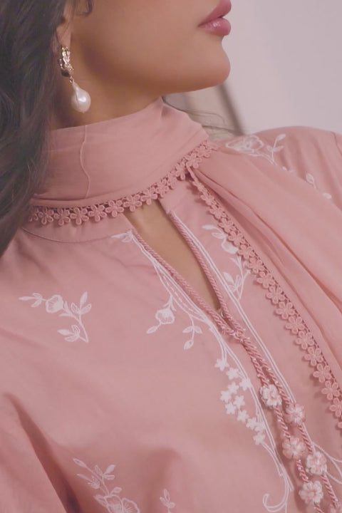 Tailored in a soft lawn base, this blush pink kurta features intricate white floral thread embroidery with detailed hem borders and sleeve accents. The sleeves are round with slits and lace. The neckline is adorned with hanging tassels. The shirt's long and straight silhouette is paired with matching trousers for a clean finish.