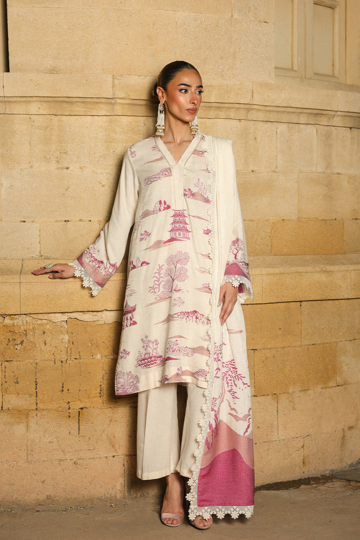 A cream-colored suit crafted from Chinese Oriental-themed jacquard, featuring subtle pink accents. Elegant and refined, it blends traditional motifs with a modern touch.