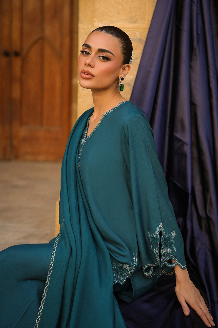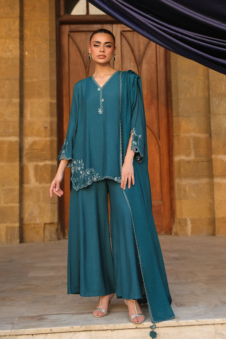 Radiate charm with this emerald 3-piece set. The knee-length shirt is designed with a flattering style and features delicate embroidered floral motifs side borders and neckline. Accompanying a smart designed dhaka pants that provides a sleek, modern fit. Paired with a beautiful matching dupatta with tassel embellishment.