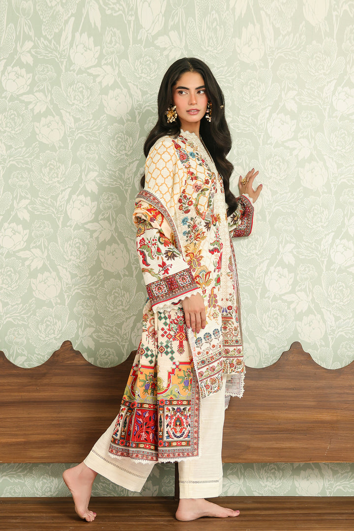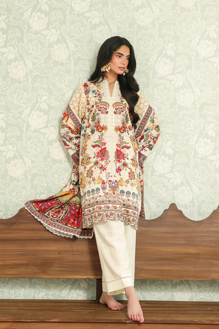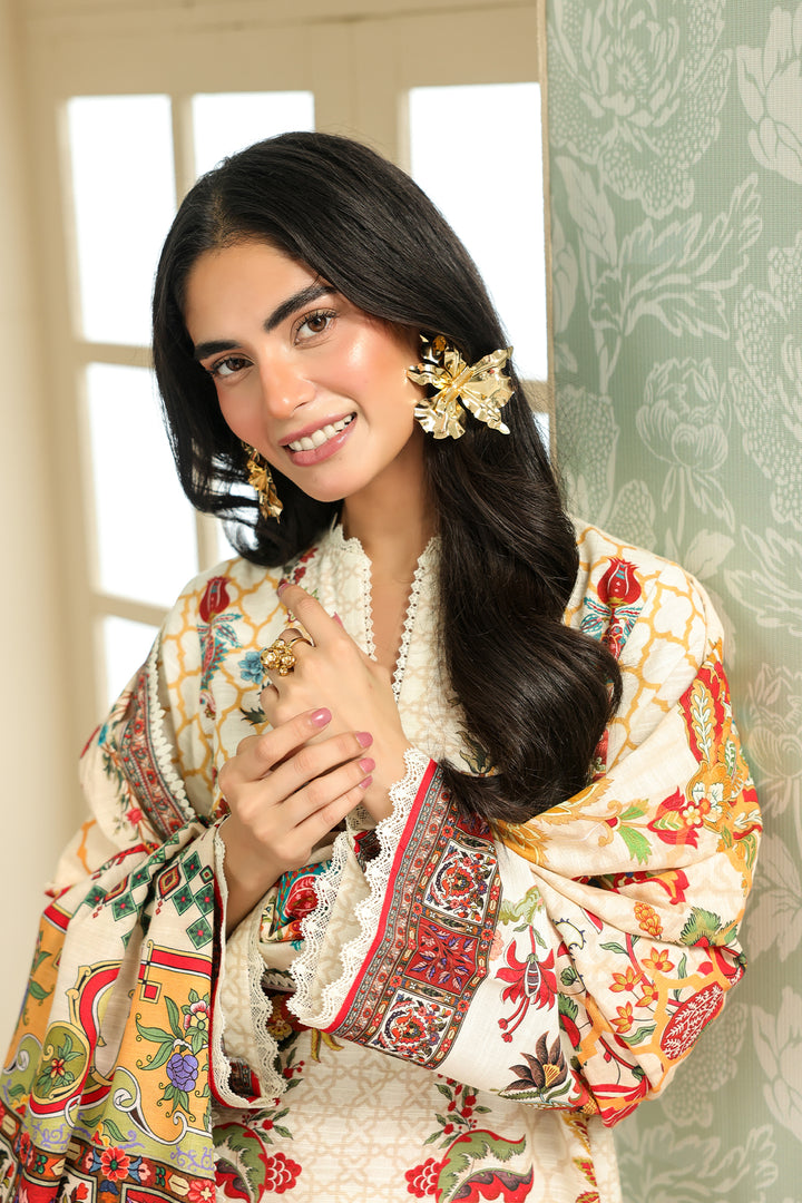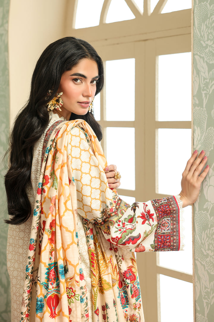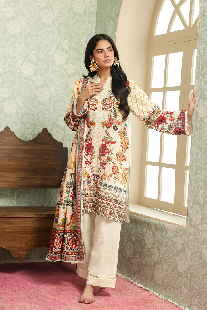 An elegant 3-piece suit featuring a soft ivory base, artistically uplifted with vivid floral bouquets in shades of red, maroon, and green. The shirt carries an intricate fusion of ornamental borders and floral motifs, lending a timelessly classic appeal. Paired with a solid ivory trouser for understated sophistication, the highlight is the dupatta, showcasing bold floral arrangements with ornate border detailing in rich hues, creating a versatile look that blends tradition with effortless style.
