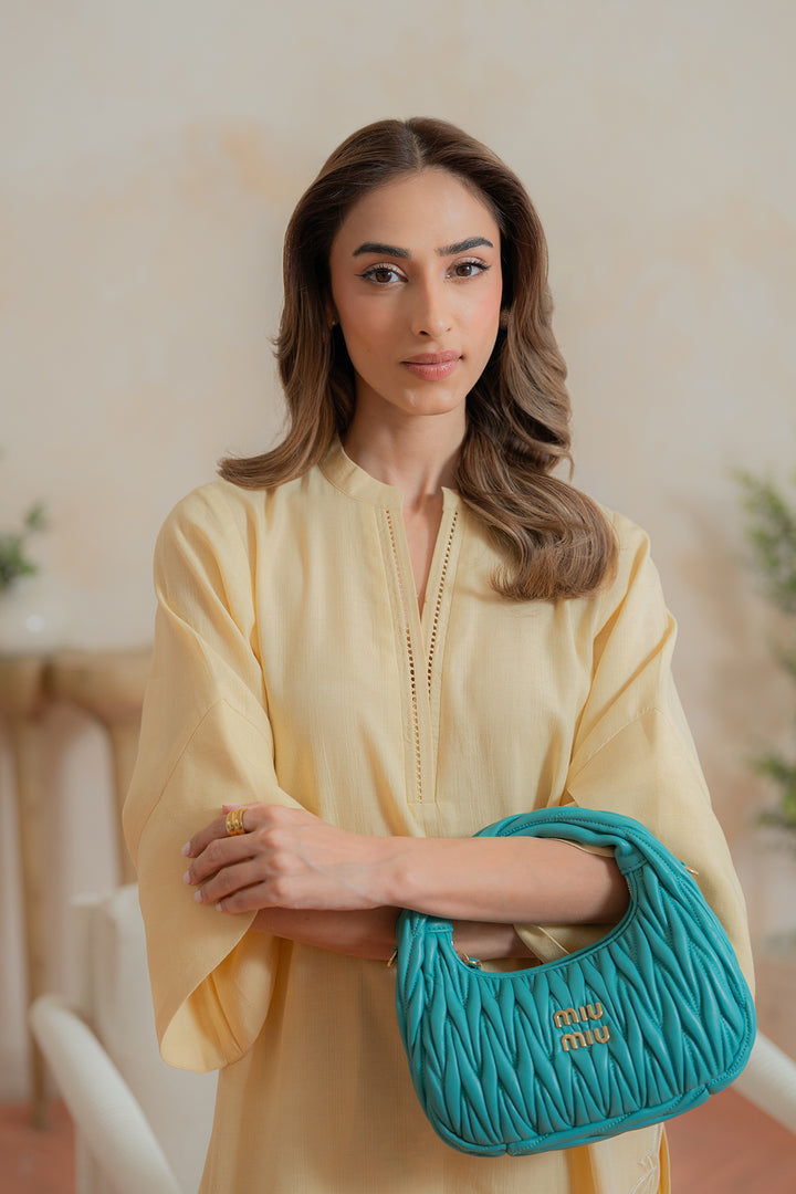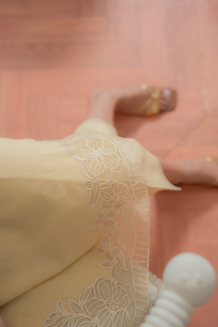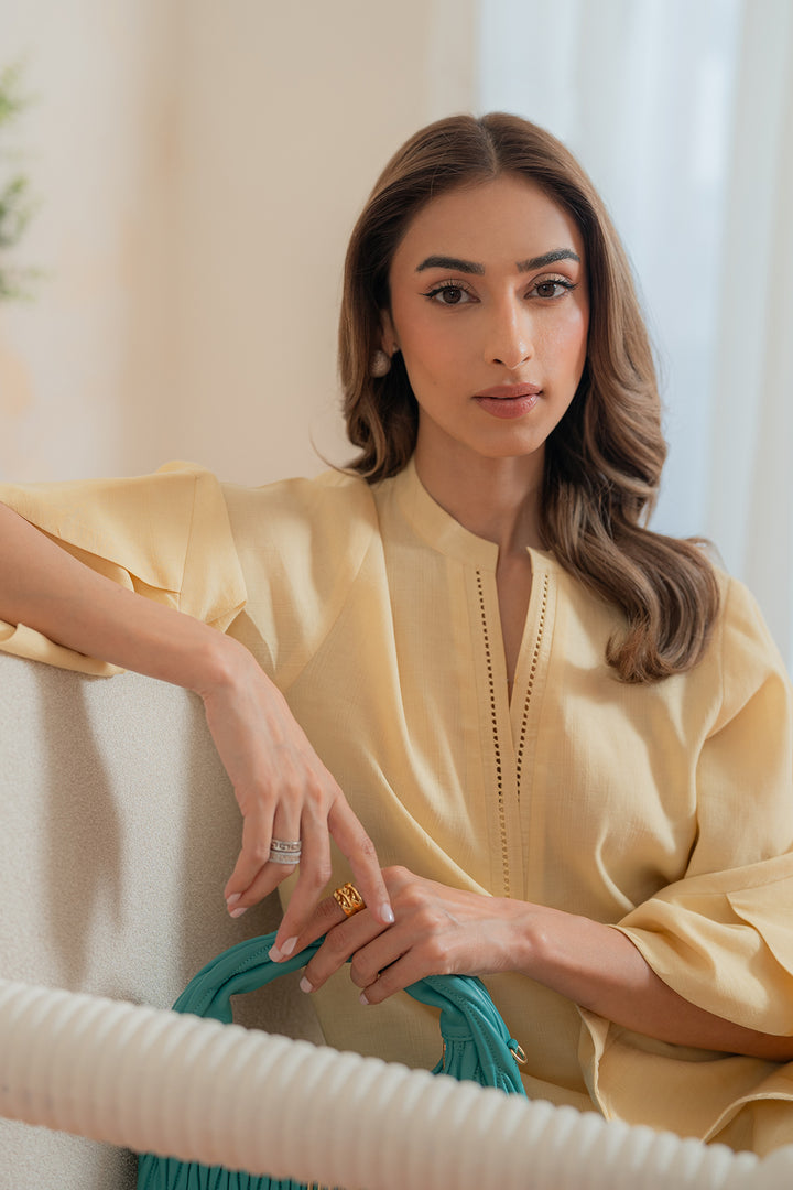 Radiate elegance in this long yellow shirt featuring delicate floral embroidery on the daman and unique overlap-cut sleeves shaped like petals. Paired with sleek straight pants for a graceful finish.