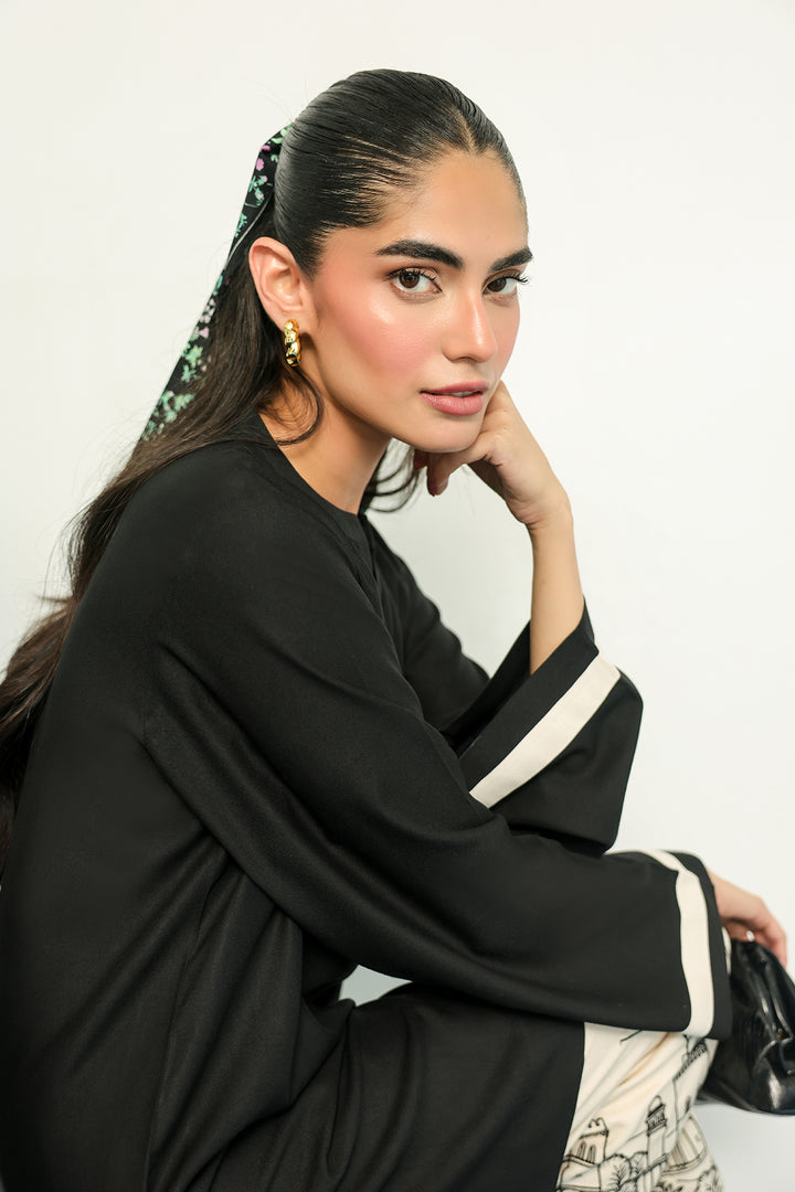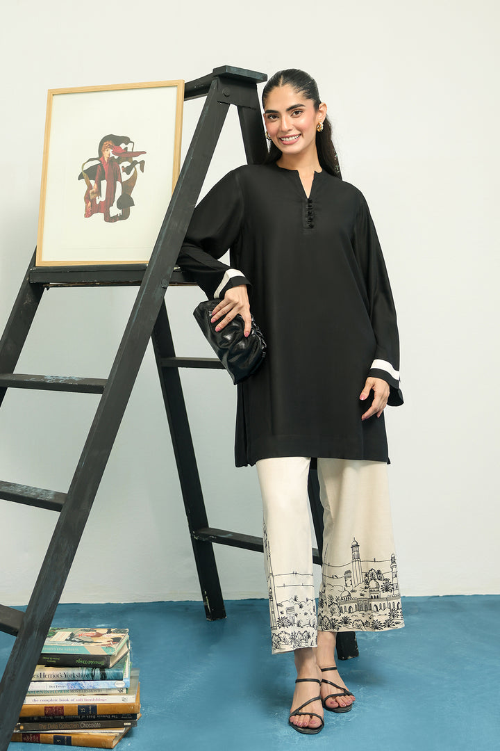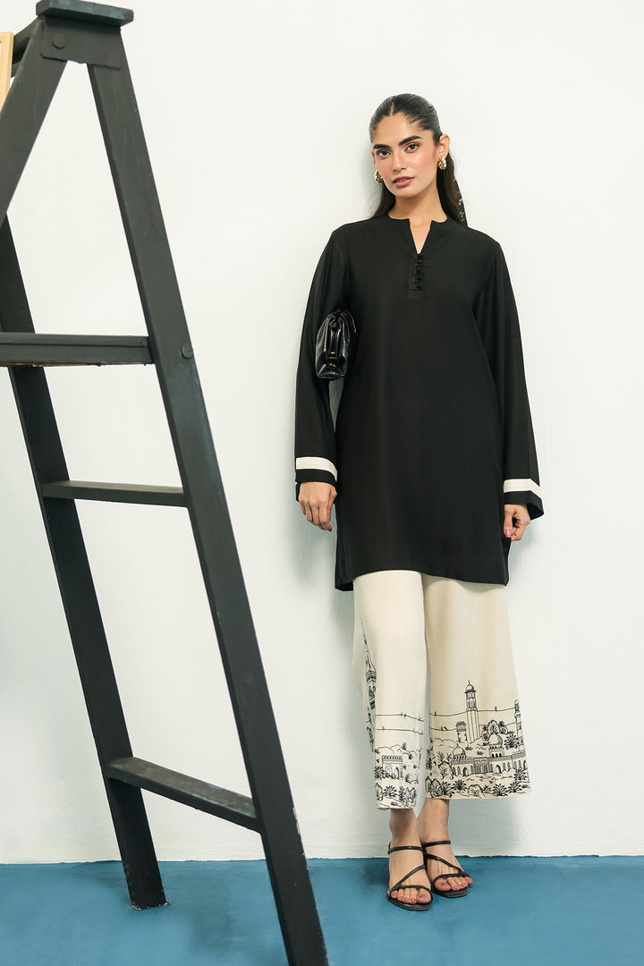 This outfit is a two piece co-ord set with the trousers being the statement piece, featuring a wide-leg or relaxed silhouette in a cream color. Trousers are adorned with intricate architectural line embroidery. This detailed work depicts a panoramic scene of buildings and structures, specifically inspired by the rich and historical architecture of Pakistan. The fine, detailed work grounds the modern outfit in a cultural aesthetic, creating a unique and sophisticated contrast with the plain black top with minimal details.