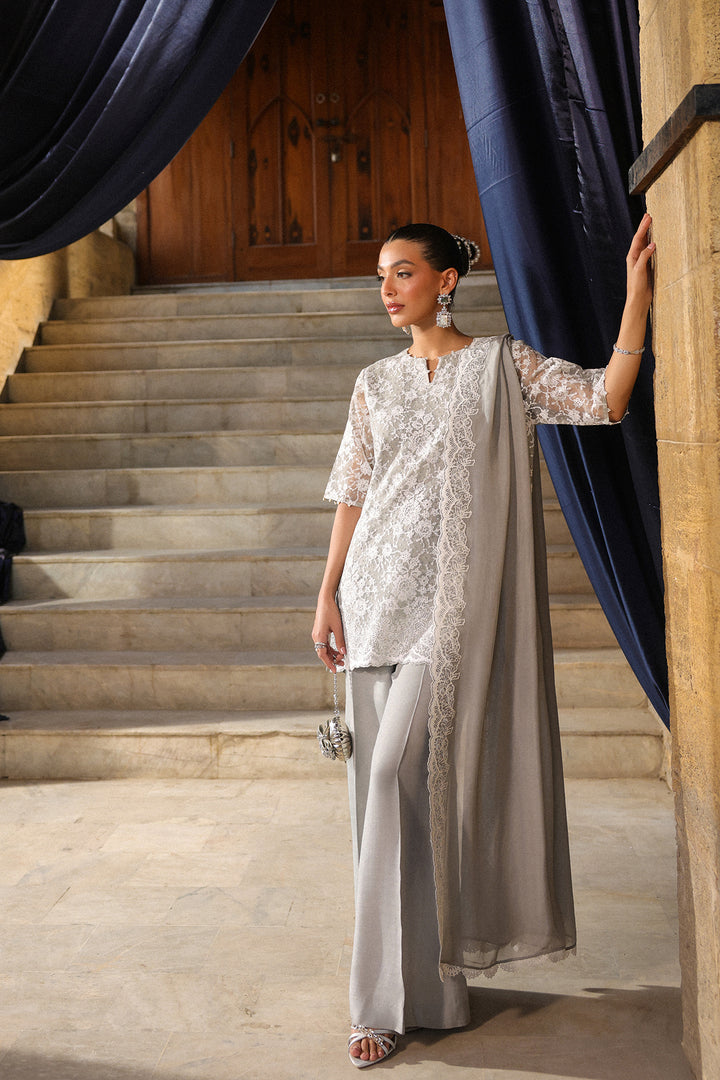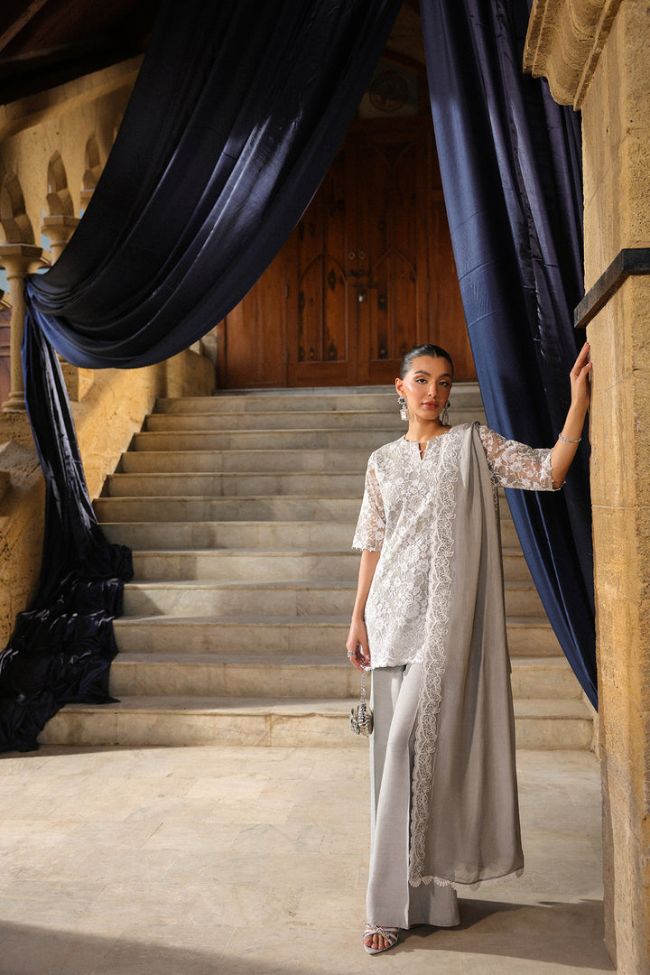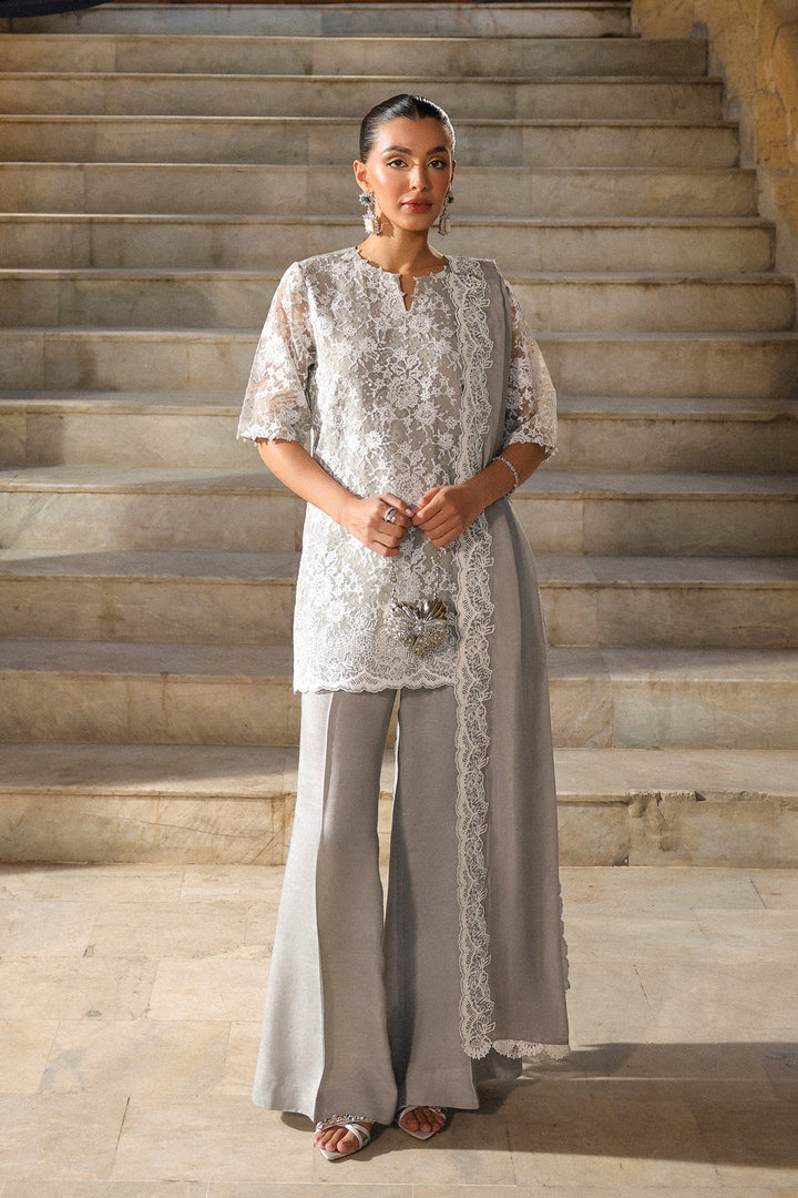 Stunning Silver grey outfit. The kameez featuring intricate Zari and Resham embroidery on the front and sleeves. The voluminous, pleated shalwar ensures majestic movement and comfort.