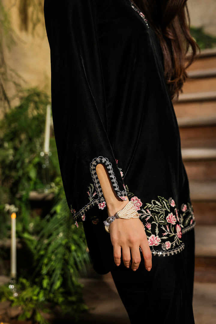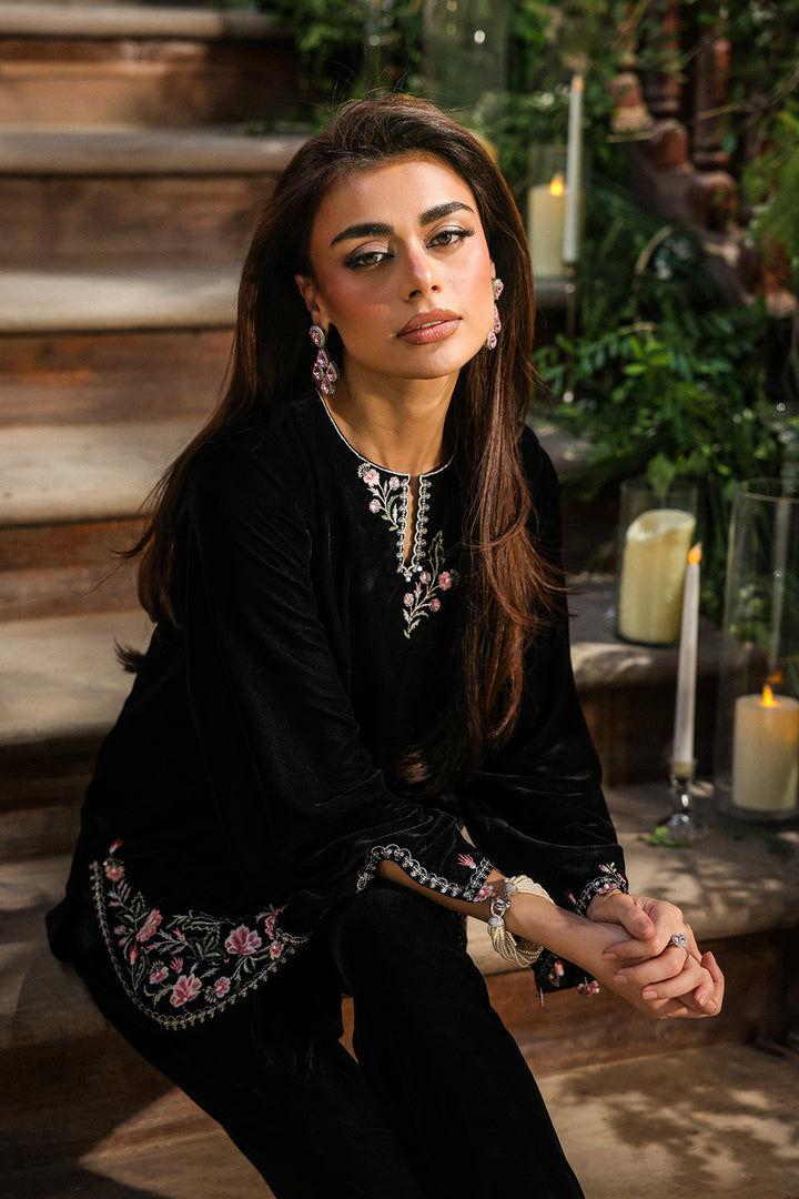 An effortlessly chic onyx black velvet Co-ord set that blends modern minimalism with timeless class. The sleek straight-cut shirt, accented with delicate embroidery at the hem and sleeves, pairs perfectly with fitted shalwar for a contemporary formal look.