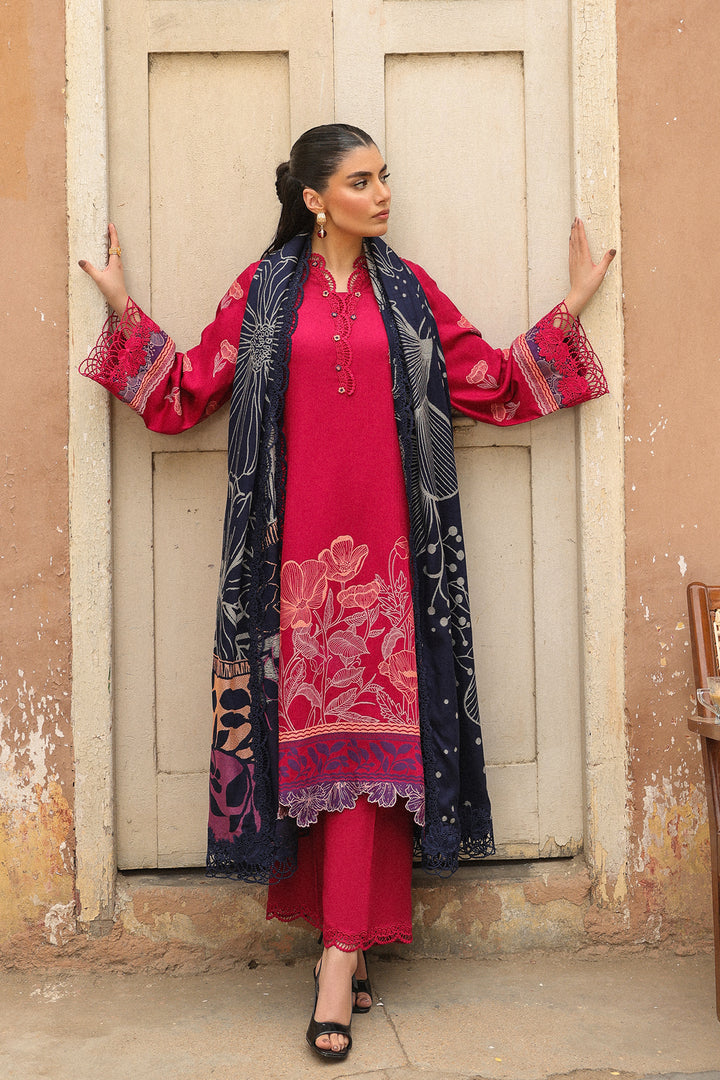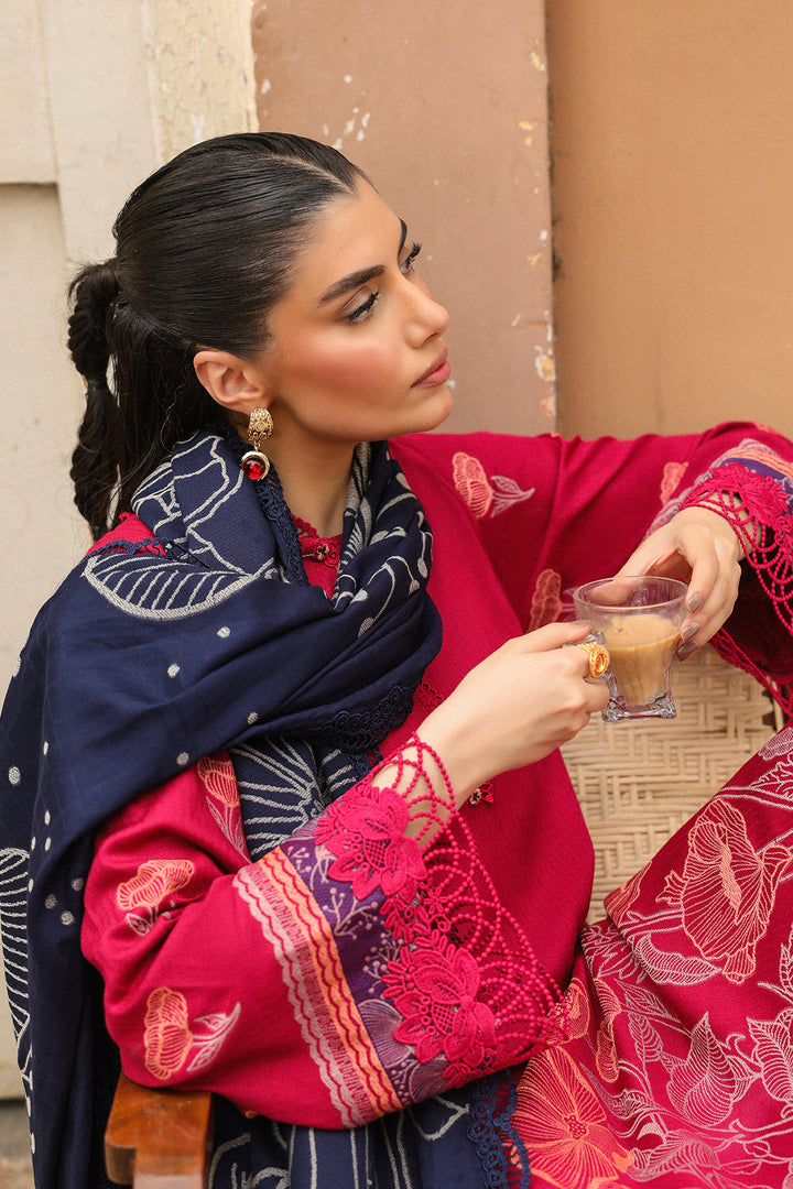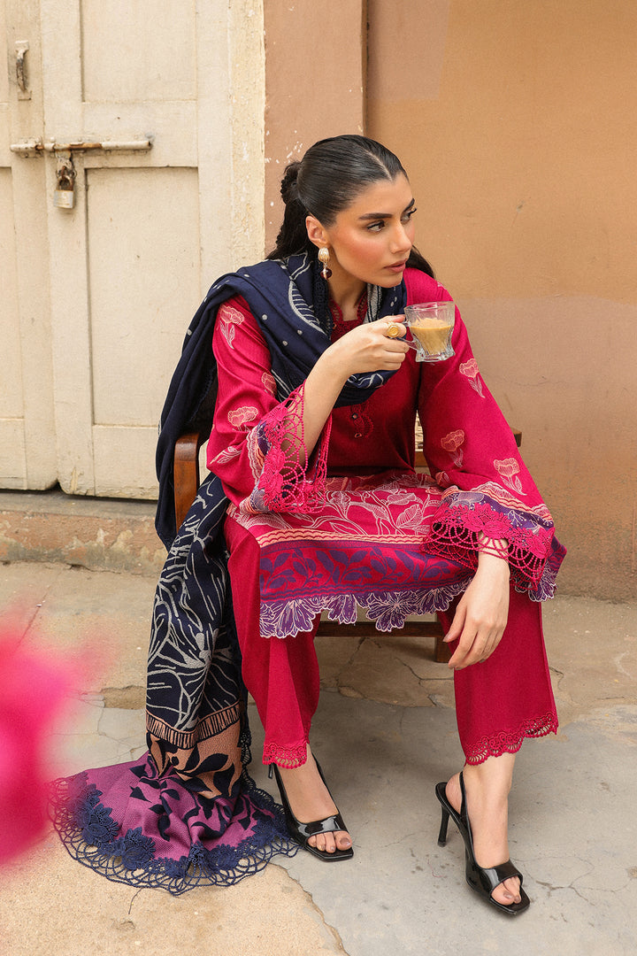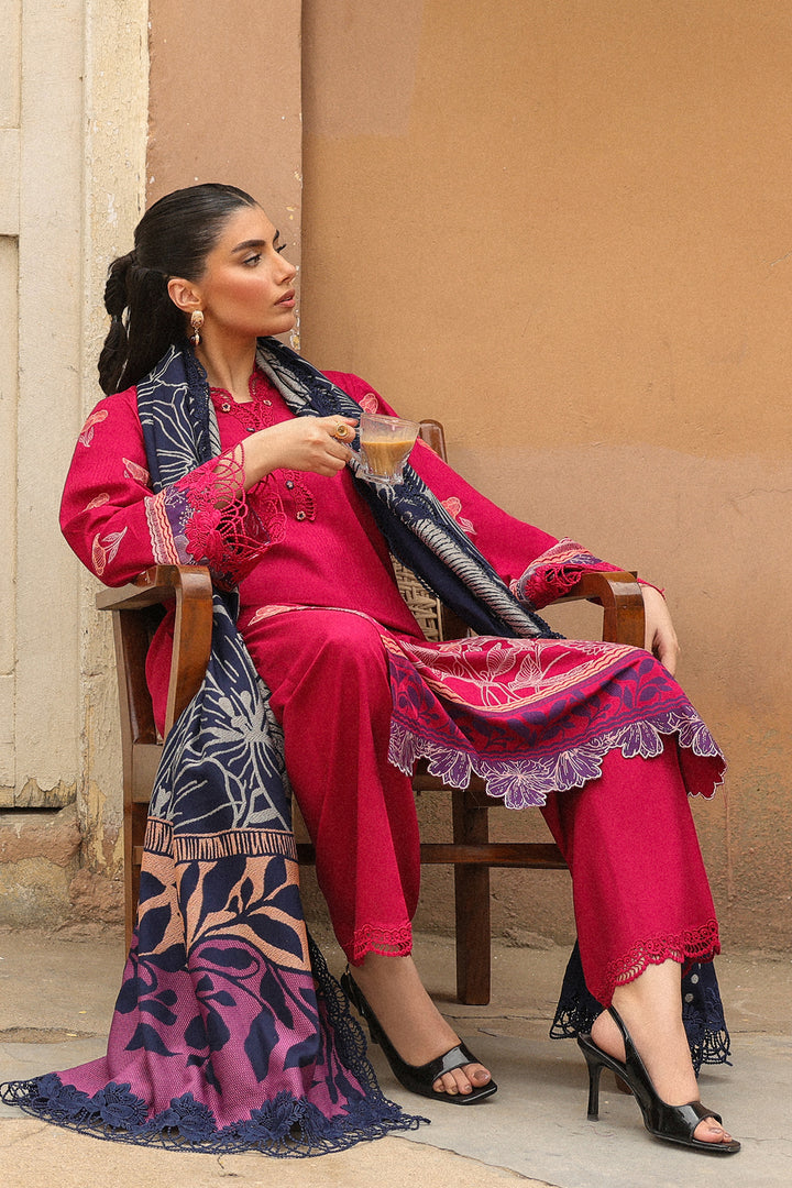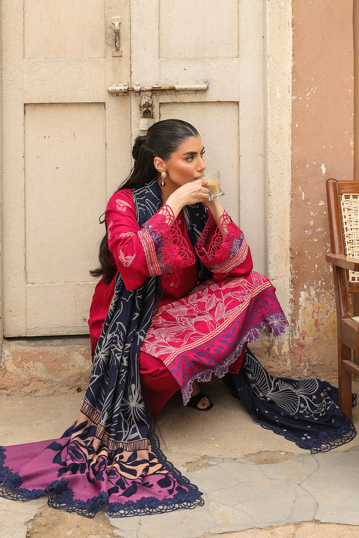 Make a vibrant statement in this contemporary hot pink suit, adorned with a delicate floral jacquard design. Paired with contrast blue shawl, the look is elevated by an asymmetric a bold pink and orange color-blocked pallu—adding a playful yet sophisticated edge. Perfect for festive occasions with a modern flair.