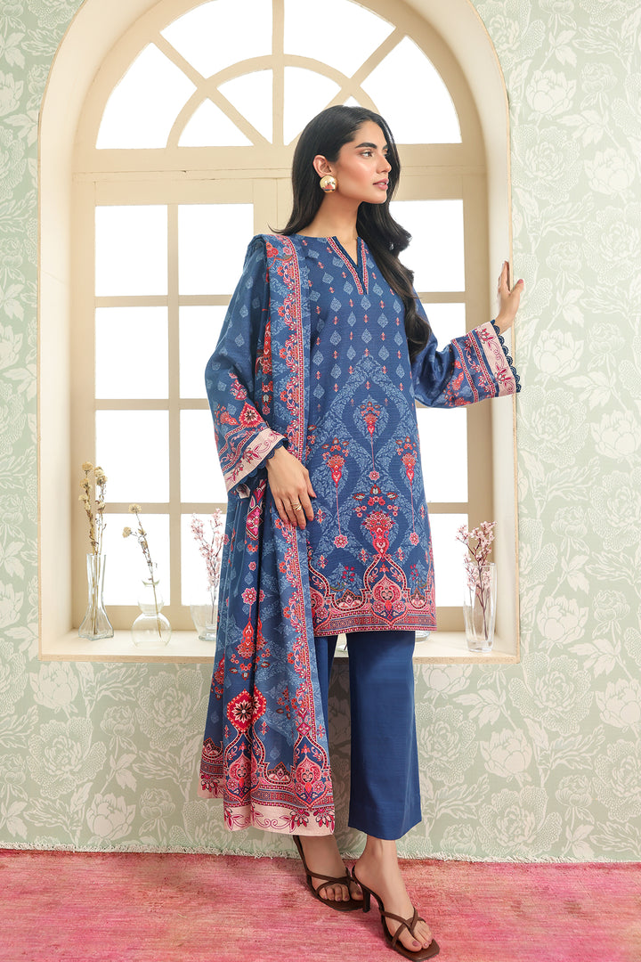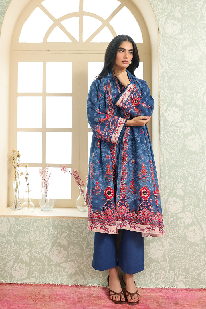 This stunning 3-piece set showcases a straight-cut kurta in a muted denim blue shade, featuring intricate ethnic-inspired motifs in coral, rose pink, and ivory tones. The neckline and sleeve borders are accented with delicate printed details, creating a refined finish. Paired with solid matching trousers and a coordinating printed dupatta with ornate borders, this ensemble is perfect for elevating your everyday style with a pop of bold yet elegant color.