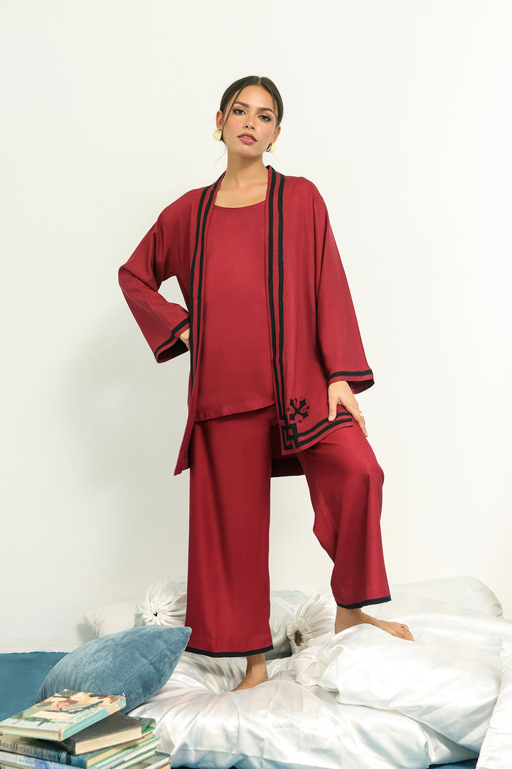 A chic 3 piece set in rustic orange, featuring a camisole, wide-leg trousers, and an open long jacket. The set is defined by striking black applique work with bold geometric motifs detailing the jacket's trim and hem, providing a sophisticated, handcrafted contrast.