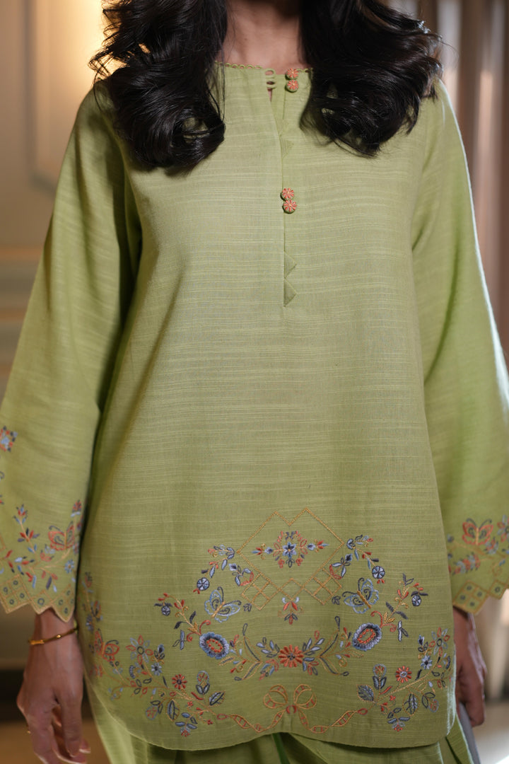 A refreshing sage green co-ord set highlighted with multi-coloured floral embroidery across the hem and sleeves. Paired with tan flats and a casual tote, the look balances comfort and style with effortless sophistication.